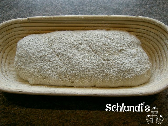 Teig auf eine bemehlte Arbeitsfläche geben und 8-10 mal mit Teigkarte und bemehlten Händen falten, anschließend zu deinem Rechteck drücken und aufrollen. Mit dem Rollenende in ein ovales Gärkörbchen legen. Oder rundwirken und mit dem Schluss in ein rundes Gärkörbchen geben, bemehlen und abgedeckt bei Zimmertemperatur ca. 50-60 Min. ruhen lassen.