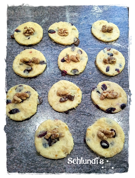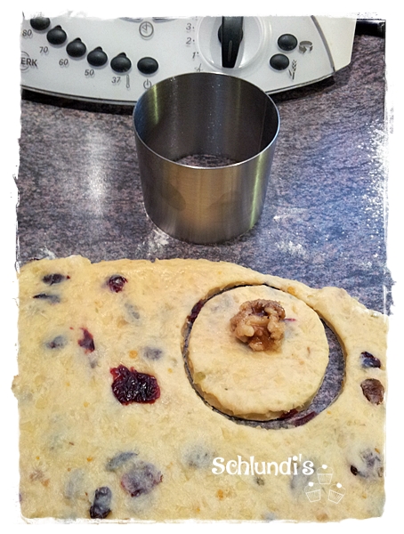 Teig dann auf eine bemehlte Arbeitsfläche kippen und die Cranberrys mit der Hand einarbeiten. Den Teig auf eine Stärke von ca. 5mm ausrollen und kleine Kreise ausstechen. Entweder mit einem Glas, oder ich hatte, einen Servierring mit einem Durchmesser von ca. 6cm. Dann in jeden Kreis ein bisschen Walnusskaramell legen und zusammen klappen, damit es eine Stollenform erhält. (Ähnlich wie eine Ravioli ? )