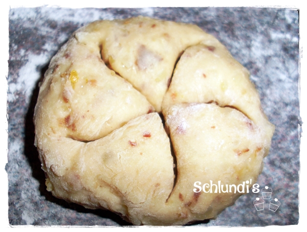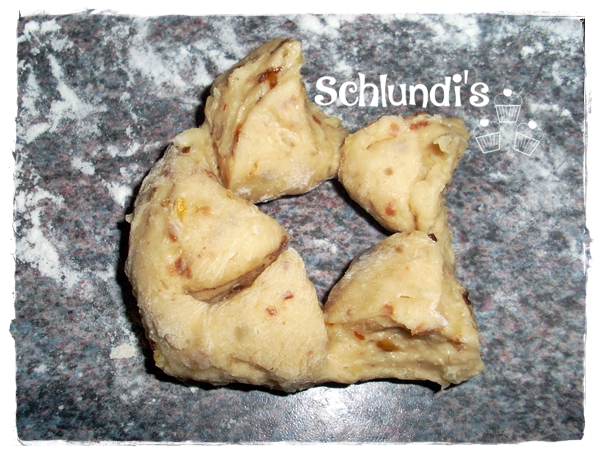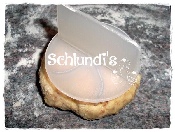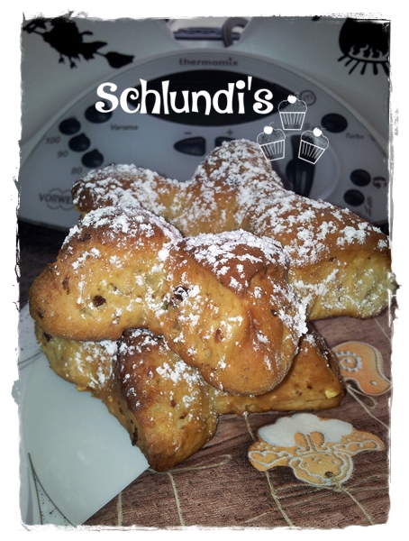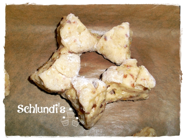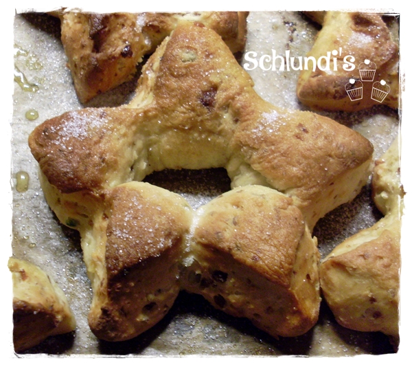 Die Portionen dann zu kleinen Kugeln rollen und mit einem Brötchenteiler einmal in der Mitte bis unten durchdrücken – die Ecken von Innen nach Außen ziehen – wie auf den Bildern zu sehen ist, dann entstehen die Sterne.