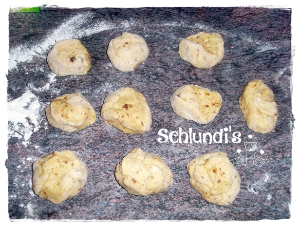 Den Teig dann in einer bemehlten Schüssel 30-40 Min. gehen lassen, er sollte sich verdoppelt haben. Teig kurz durchkneten und in 10 gleich große Stücke teilen.