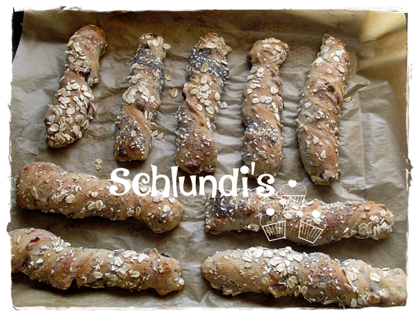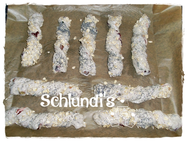 Den Teig gleichmäßig mit Mohn und Sesam bestreuen einmal der Länge nach Mittig mit einer Teigkarte abteilen und jeweils aus jedem Teil 8 Stangen abstechen. Die Stangen mit geölten Händen in sich verdrehen und auf ein mit Backpapier ausgelegtes Backblech legen.