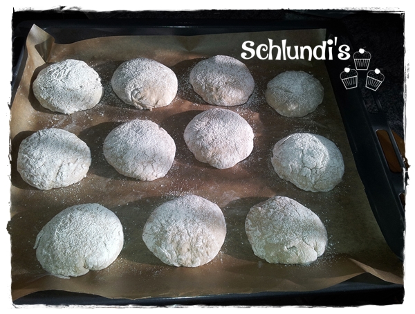 Anschließend auf eine gut bemehlte Ablagefläche kippen, 10 Teiglinge abstechen, der Teig klebt stark!!! Entweder die Hände gut bemehlen, oder mit nassen Händen arbeiten!!! Die Teiglinge nun in die Hand nehmen und ähnlich wie Frikadellen formen, auf ein mit Backpapier belegtes Backblech legen, und mit Roggenmehl bestäuben. Die Vinschgerl NICHT abgedeckt solange ruhen lassen, bis der Teig Risse wie kleine Inseln bildet.