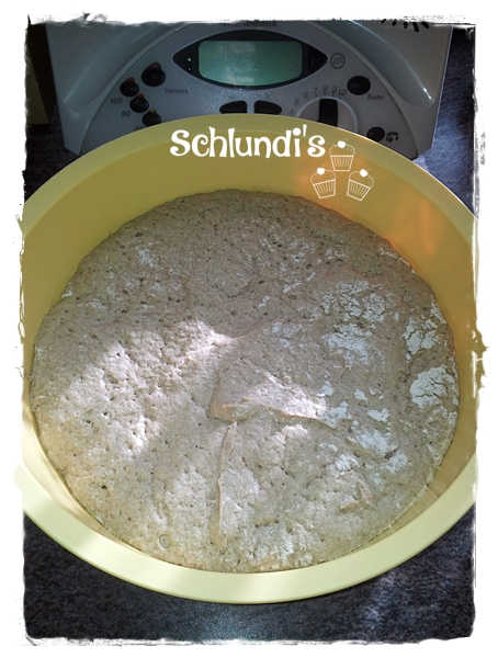 Teig dann abgedeckt bei Zimmertemperatur ca. 30 Minuten gehen lassen. Er soll sich deutlich vergrößert haben.