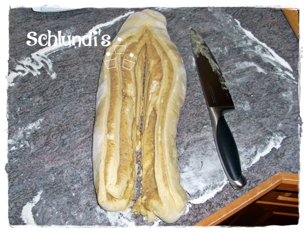 Teig auf einer bemehlten Arbeitsfläche zu einem Rechteck ca. 45×35 cm ausrollen, Masse darauf verteilen und zu einer Rolle formen. Die Teigrolle mit einem Messer einmal in der Mitte bis nicht ganz oben durchschneiden. Die beiden Stränge um die eigene Achse drehen und mit einander verdrehen so das ein Striezel entsteht.‘