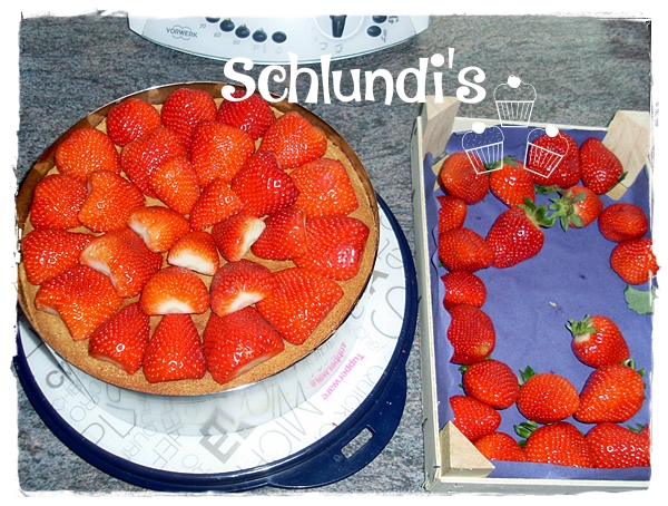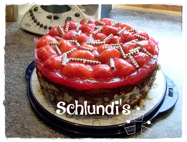 Den 2. Tortenboden auflegen, mit Erdbeeren belegen und mit dem Tortenguß überziehen.