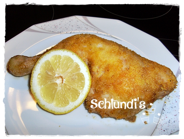 Anschließend die Polenta auf einen Teller geben und die Hähnchenteile darin wenden so dass alle Seiten gut bedeckt sind.