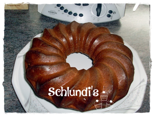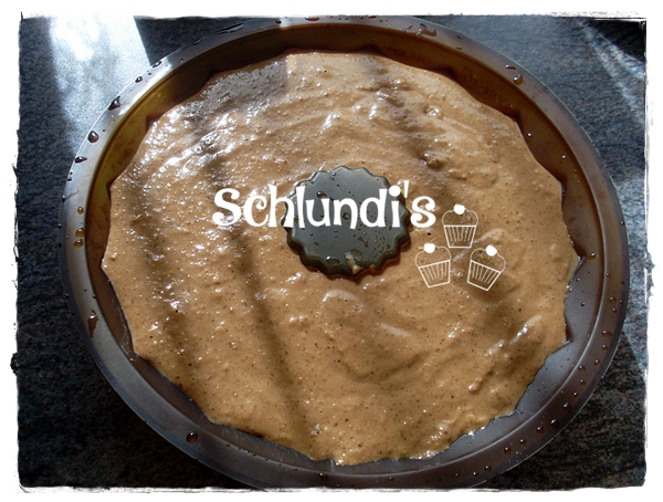 Den Kuchenteig in eine Kasten- Kranz- oder Gugelhupfform füllen.