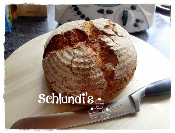 Brot in den Backofen auf die 2. Schiene von unten schieben. Einen 1/2 Messbecher vom Thermomix schwallartig auf den Boden des Backofens gießen. (Schwaden) Nach 15 Min. die Ofentüre kurz öffnen um den Dampf abzulassen – Backofen auf 190/200° zurückstellen und weitere 40-45 Min. fertig backen.